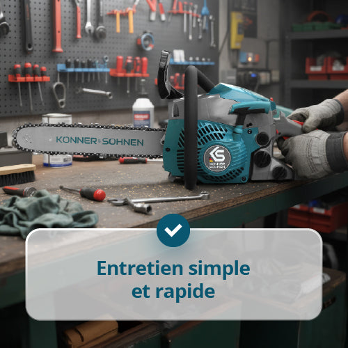 • Entretien rapide et facile – le mécanisme de tension de chaîne sans outil permet un réglage ou remplacement rapide de la chaîne sans clés ni tournevis, ce qui fait gagner du temps.