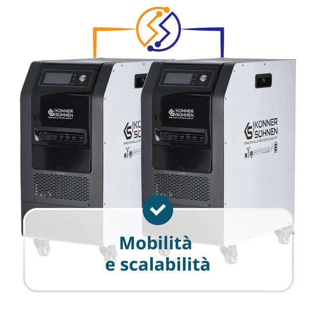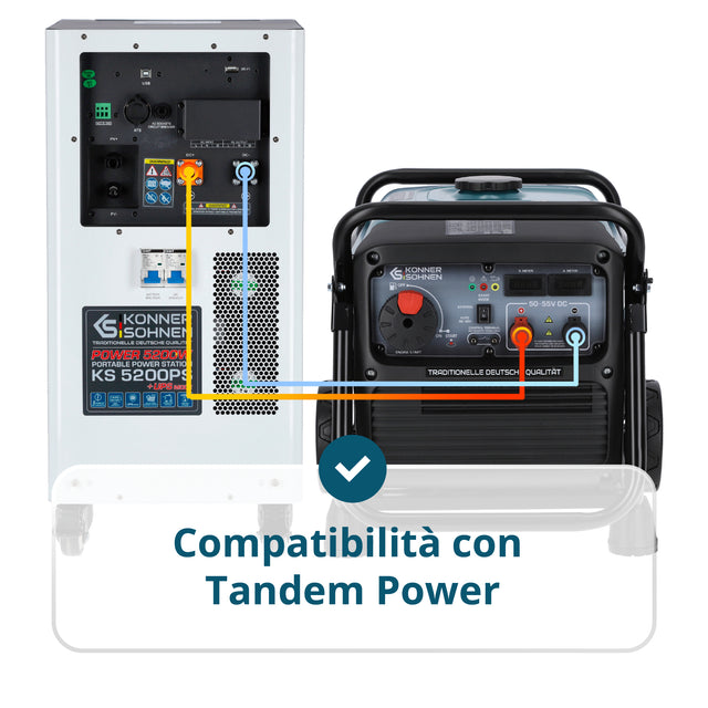 • Compatibilità Tandem Power – controllo intelligente quando si opera insieme al generatore KS 48V-DC: quando la carica della batteria scende, il generatore si avvia automaticamente, funziona alla massima efficienza e si spegne una volta che la stazione è carica.
