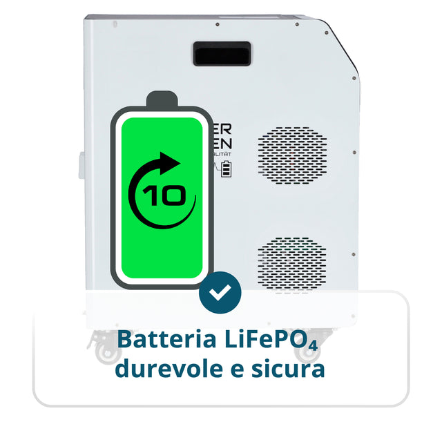 • Batteria LiFePO₄ durevole e sicura – durata fino a 6000 cicli e più di 10 anni di servizio garantiscono un investimento affidabile nell'indipendenza energetica.