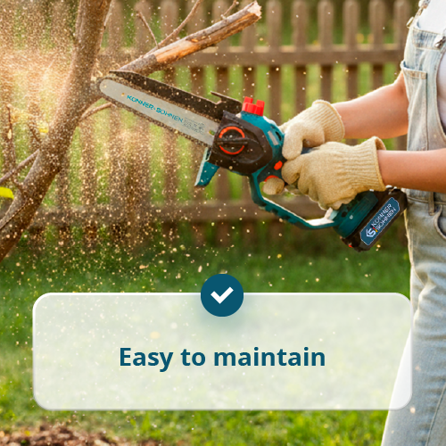 • 8″ bar length and 8 m/s chain speed – easily cuts branches up to 100 mm in diameter, perfect for tree trimming and carpentry work.